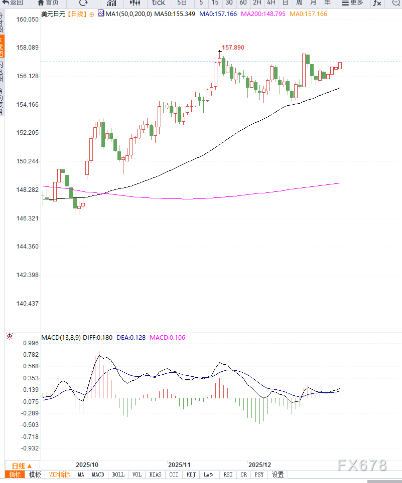 汇通财经APP讯——周一(1月5日)亚市时段,美元兑日元温和上涨,涨幅约0.24%,交投于157.20附近。上周末美国挑动地缘政治紧张局势,扣押委内瑞拉总统尼古拉斯·马杜罗,影响了避险美元需求,预计可...