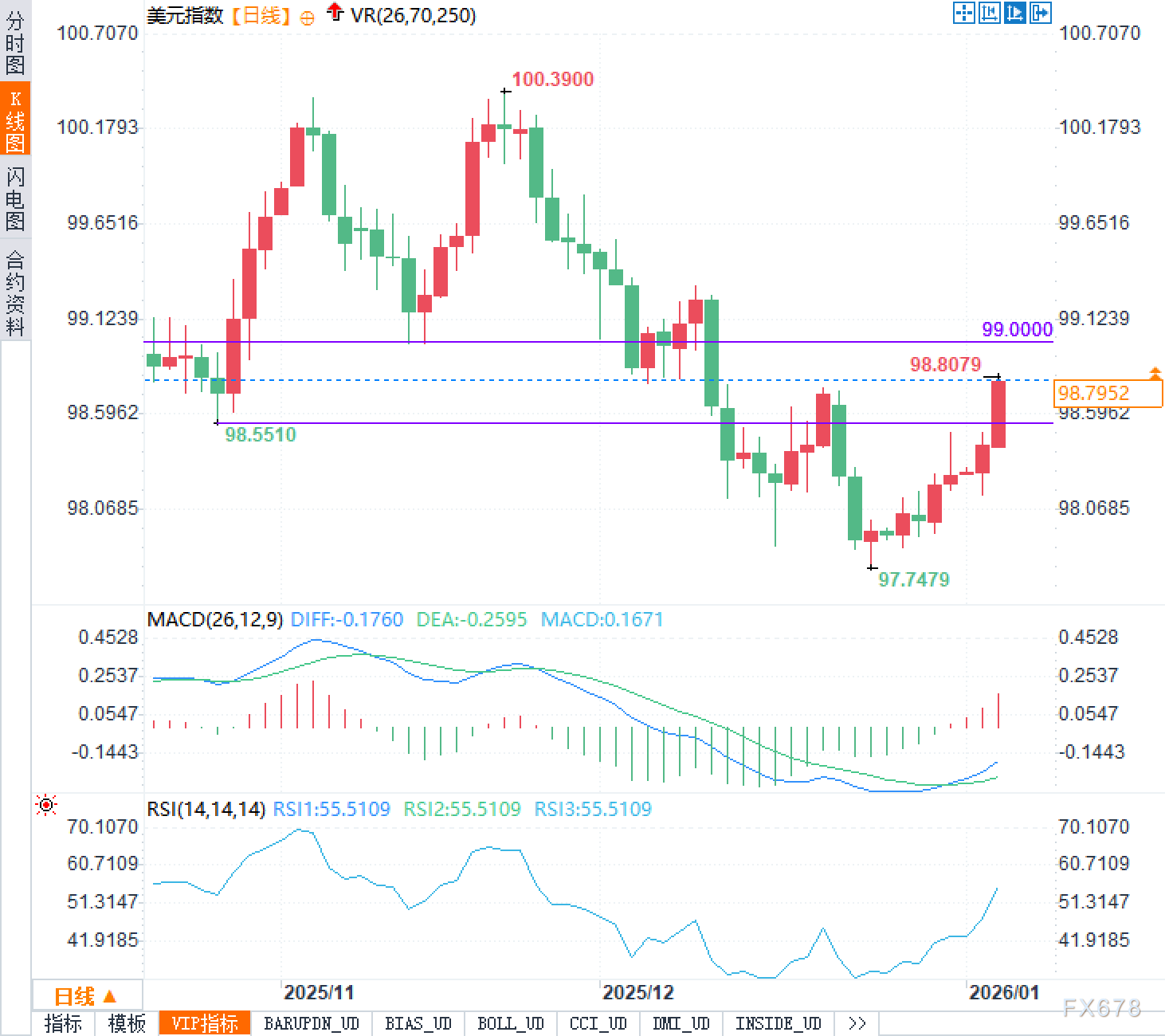汇通财经APP讯——周一(1月5日)欧洲早盘时段,美元连续第五个交易日上涨,美元指数交投于98.70附近。此次美元上行的核心驱动因素,是拉美地区地缘紧张局势升级引发的避险需求回升。 src=http:...