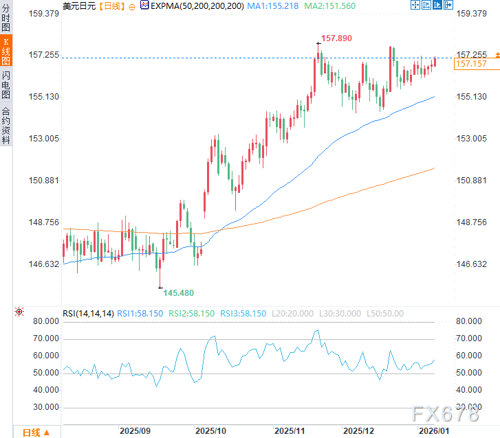 家庭支出数据与11月薪资增长数据形成鲜明对比,后者暗示年底消费可能出现回落,消费疲软对日元造成下行压力。周五亚市时段,美元兑日元震荡上行,延续前三个交易日涨势,日内涨幅约0.22%,现交投于157.20附近。