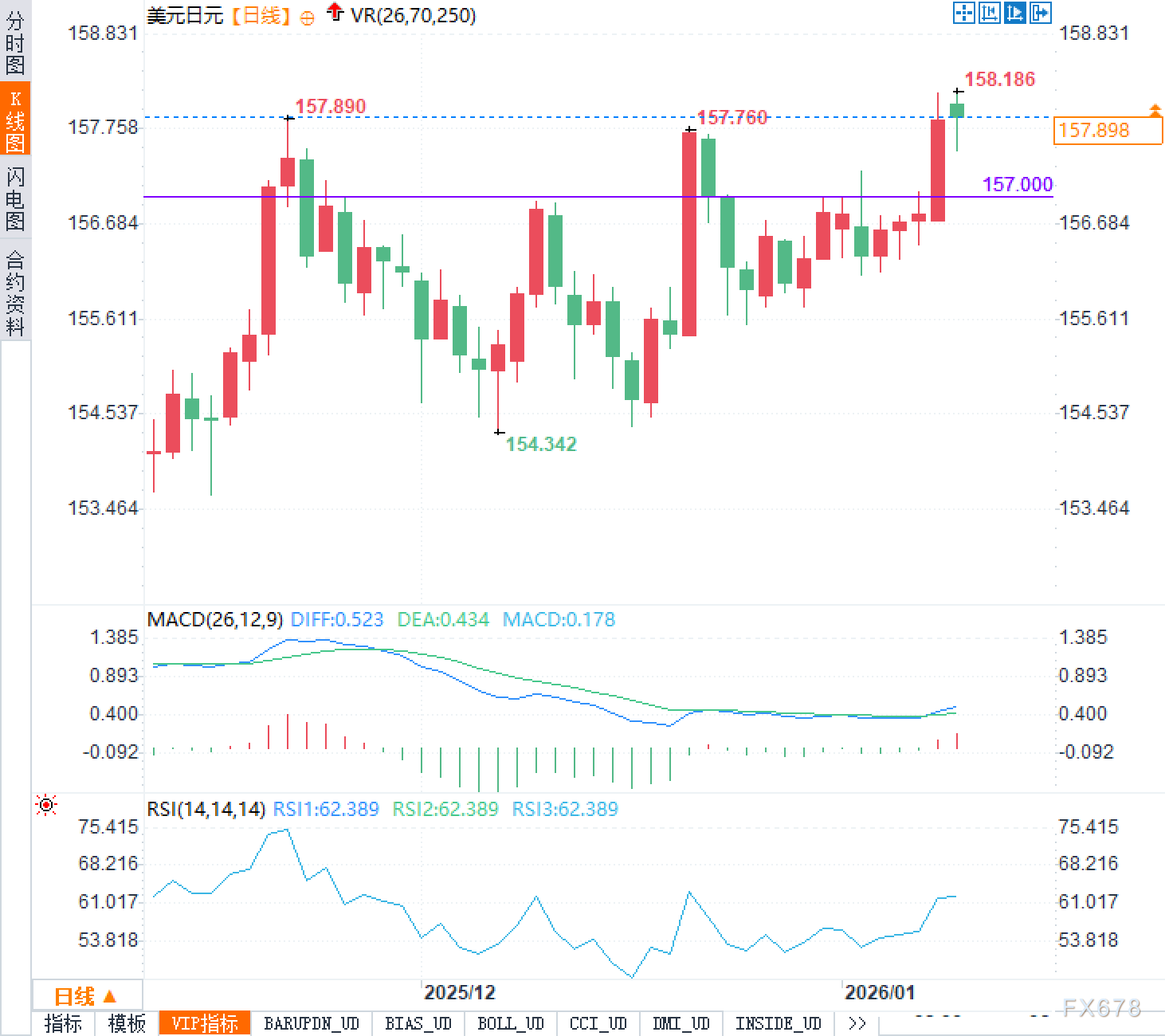 汇通财经APP讯——周一(1月12日)外汇市场刚一开盘,美元兑日元延续此前涨势,一度冲至158.20附近,创下约一年来的最高水平。这一波上涨看似凶猛,但细看之下却缺乏新的重大利好支撑。价格在触及高点后迅速降温,美市盘前回落至157.900一线附近震荡整理。这说明当前行情并非由强劲买盘推动,更像是前期趋势的惯性延伸与高位换手——即部分资金获利了结,而另一些交易员仍在观望是否值得追高。