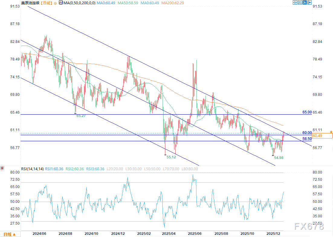 汇通财经APP讯——周二(1月13日)欧盘时段,西德克萨斯中质原油(WTI)价格连续第四个交易日呈现上涨趋势,盘中交投于每桶60.63美元,涨幅1.90%。美国总统特朗普宣布了对伊朗贸易伙伴实施新的关税措施,导致供应方面的担忧加剧,WTI价格攀升至六周来的最高水平。