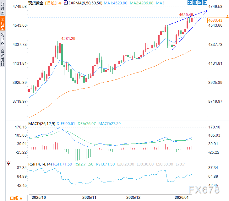 汇通财经APP讯——周三(1月14日)亚欧时段,现货黄金回升至每盎司4635美元附近,日内涨幅约1%,一度触及4639.49美元的历史新高。随着美国通胀数据趋软,市场对美联储降息的预期升温,黄金等贵金属正吸引买家入场。