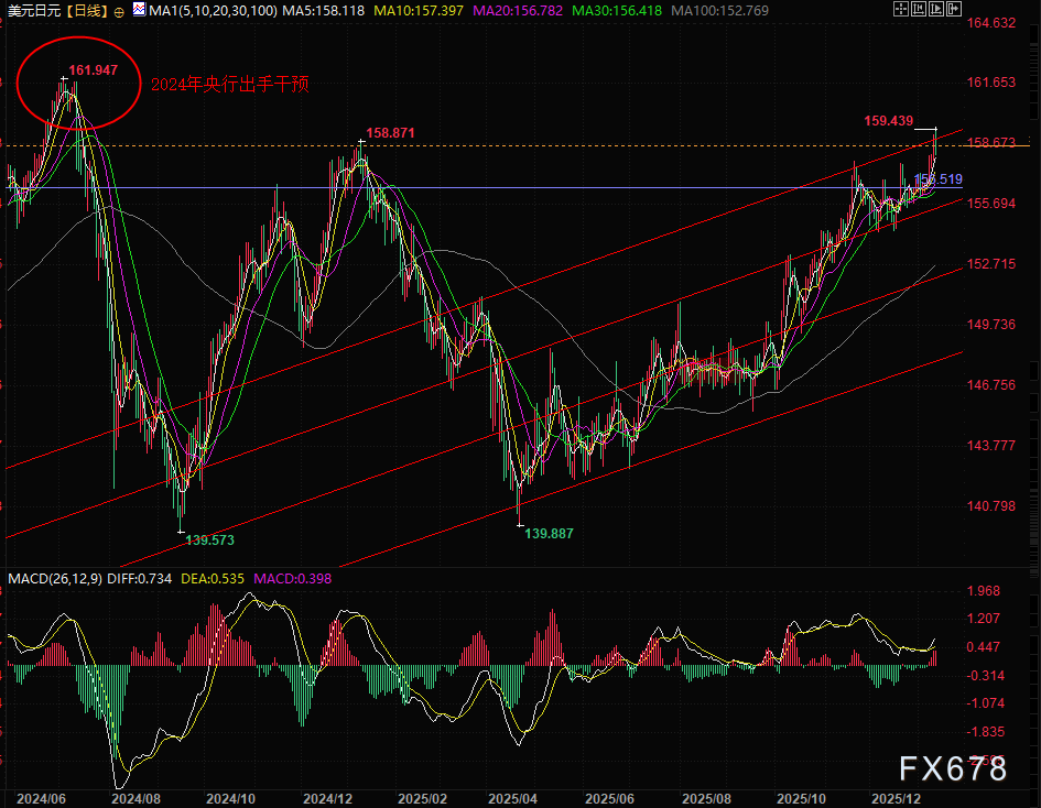汇通财经APP讯——周三(1月14日)美元兑日元汇率正朝着2024年7月以来的关键关口加速迈进,目前已触及159.43的高点,距离市场紧盯的160目标仅一步之遥。