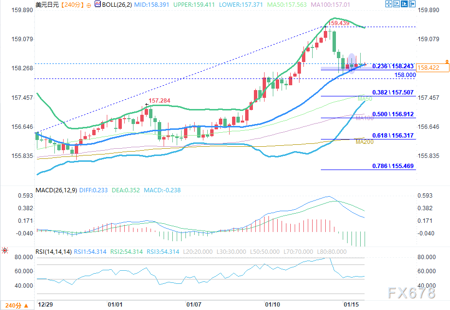 汇通财经APP讯——周四(1月15日)欧盘时段,美元/日元今日分时图走出“冲高回落+震荡”走势:早间从低位拉起后冲高至158.9附近,随后回落至158.4区间下沿震荡,显示上方存在抛压,短期进入区间整理阶段。