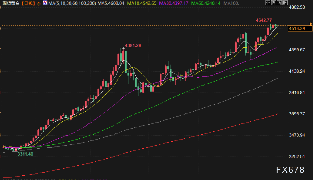 受美国强劲就业数据及地缘政治紧张局势缓和影响,金价周四从历史高位回落。现货黄金下跌0.1%,收于每盎司4614.93美元;美国期金收跌0.3%,至4623.70美元。下跌主要受两大因素驱动:上周美国初请失业金人数意外下降,提振美元指数升至数周高位,使得以美元计价的黄金对其他货币持有者而言更加昂贵。