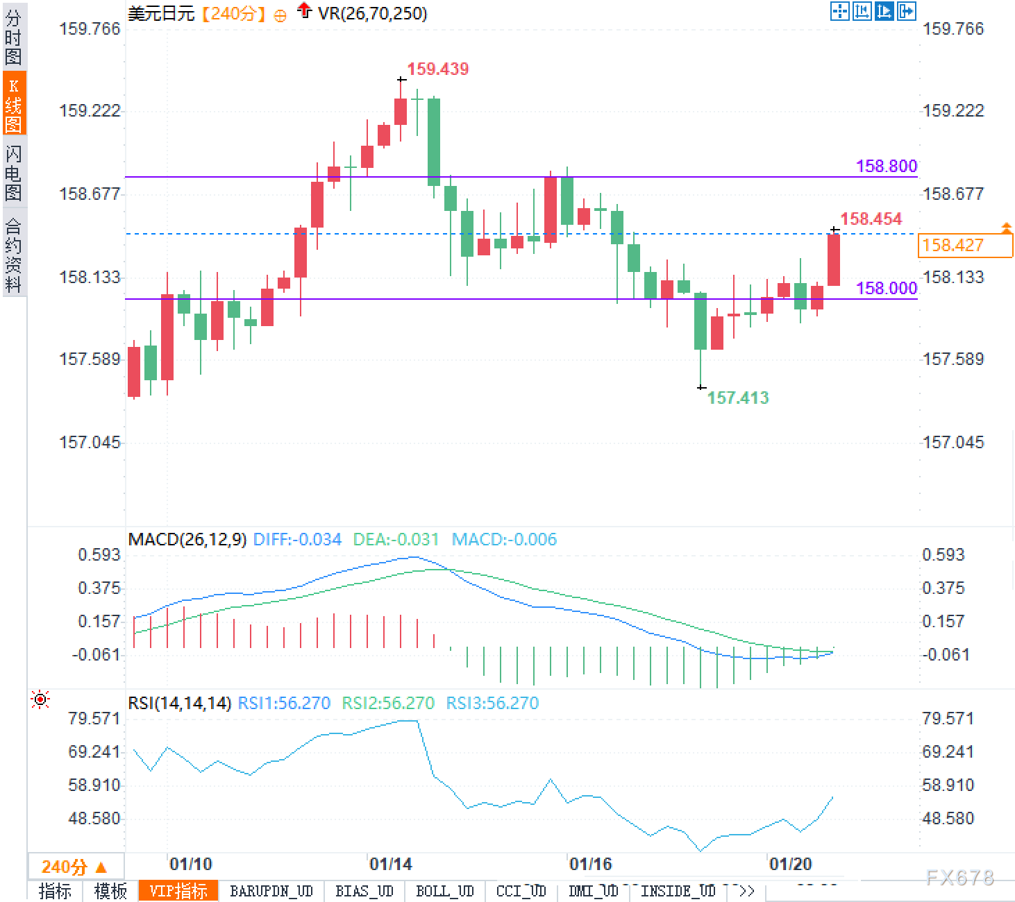 汇通财经APP讯——周二(1月20日)美元兑日元欧市早盘交投158.50附近,进入技术性修复阶段。此前价格一度冲高至159.439,创下18个月新高,随后回落至157.413,形成明显震荡格局。当前价位处于区间中上部,上方158.800构成初步压力,下方158.000则是关键心理支撑。