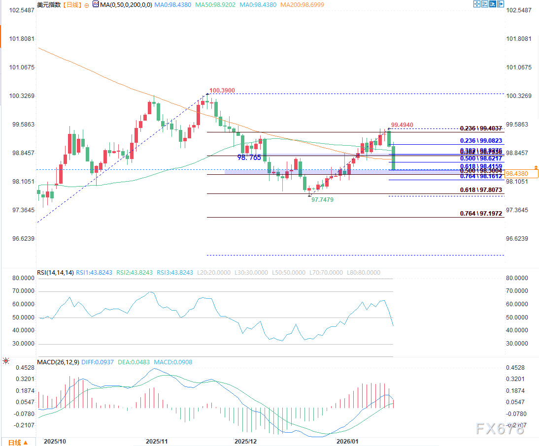 汇通财经APP讯——美元指数这两天确实大幅回调,从上周高点99.39附近回落,目前已跌至98.50左右(日内最低触及98.44-98.67区间),单日跌幅约0.5-0.9%,延续第二天下跌趋势。