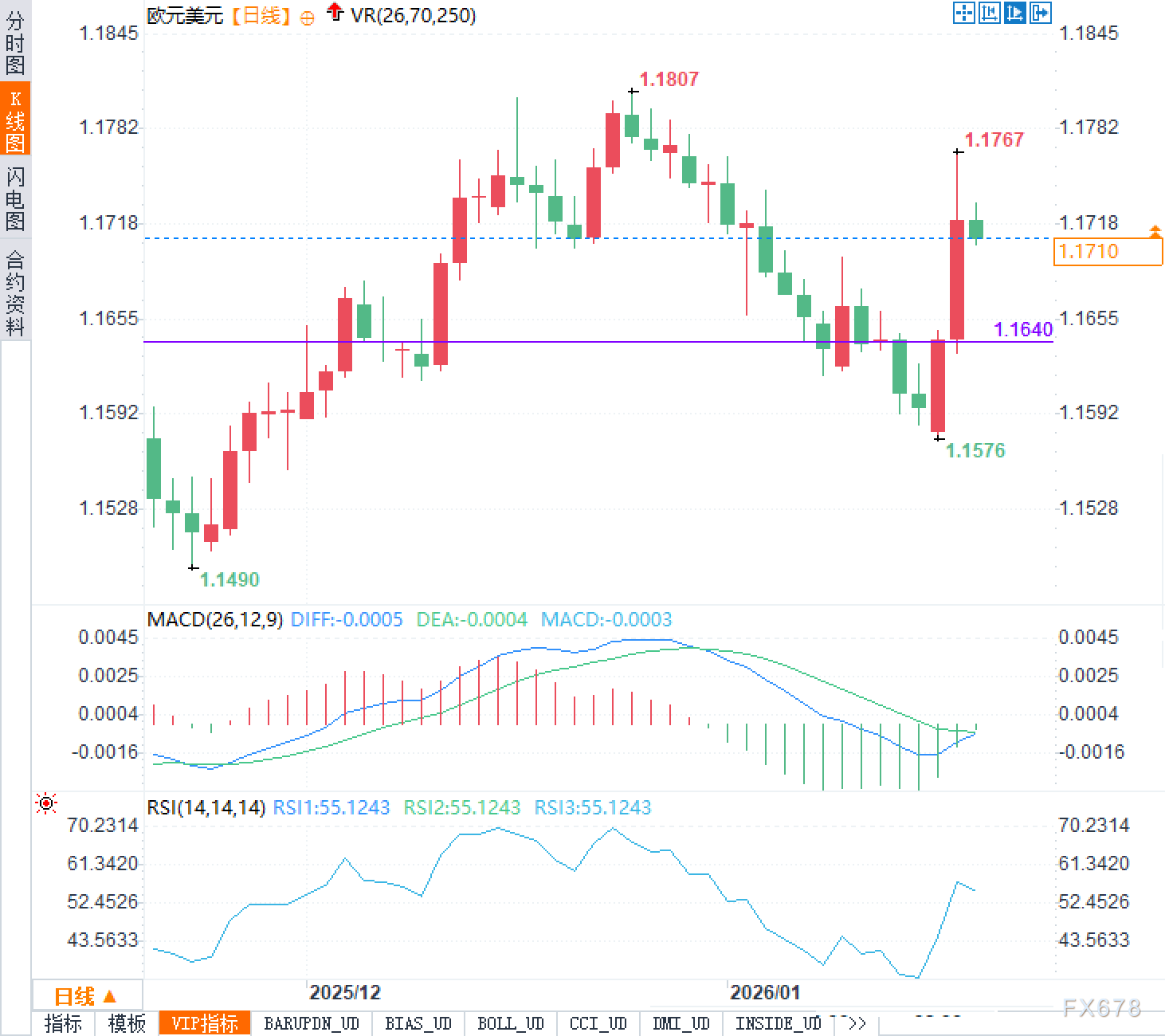 汇通财经APP讯——最近两天,欧元兑美元一口气涨了约1.1%,一度冲到1.1767的高点,虽然随后有所回落,但整体仍稳稳站在1.17上方。周三(1月21日)盘中最低也没跌破1.17这个关口,欧洲时段报价维持在1.1710附近,日内波动不大,市场像是进入了“等待模式”。