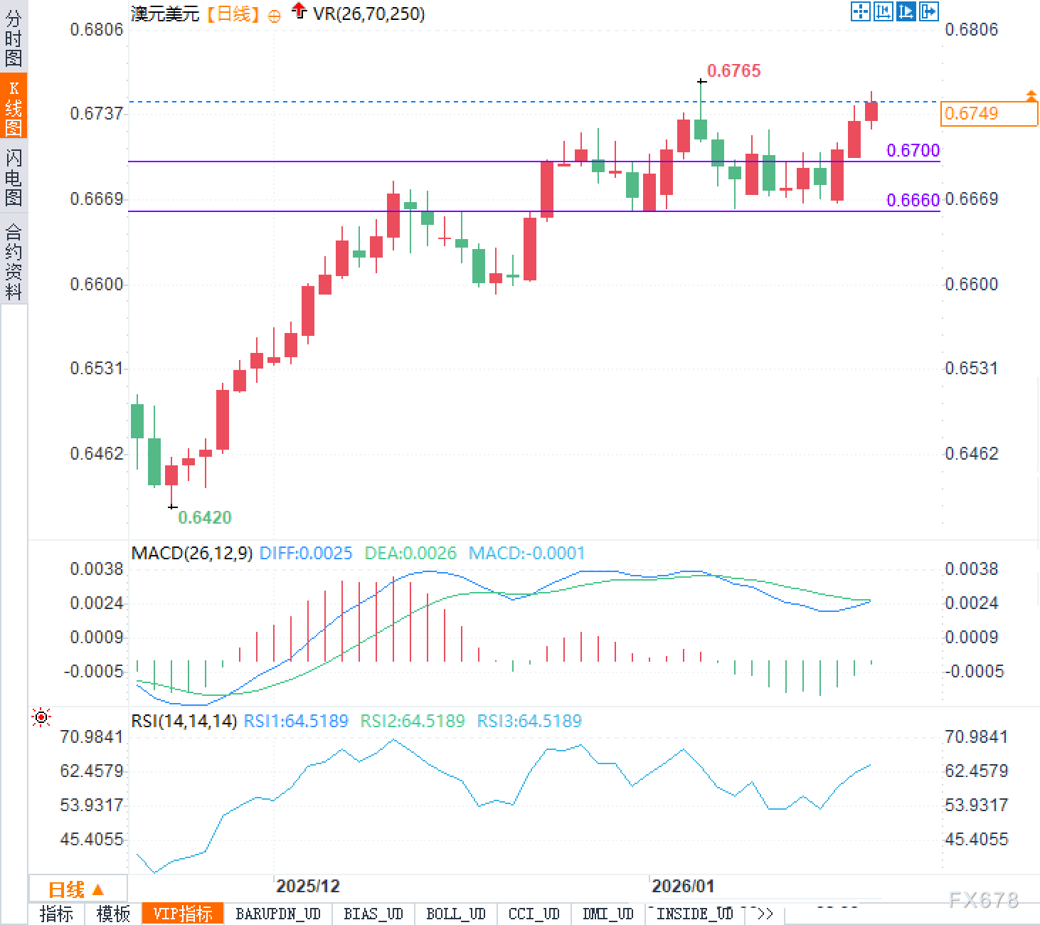 汇通财经APP讯——周三(1月21日),澳元兑美元欧洲时段交投0.6750附近。盘面上延续了近阶段的上升趋势结构,价格在0.6700上方反复巩固后再度走强,并一度上探至0.6760附近。短线节奏呈现典型多头推进形态,但上方阻力区尚未被有效打穿,同时行情伴随对关键事件的头条敏感波动。
