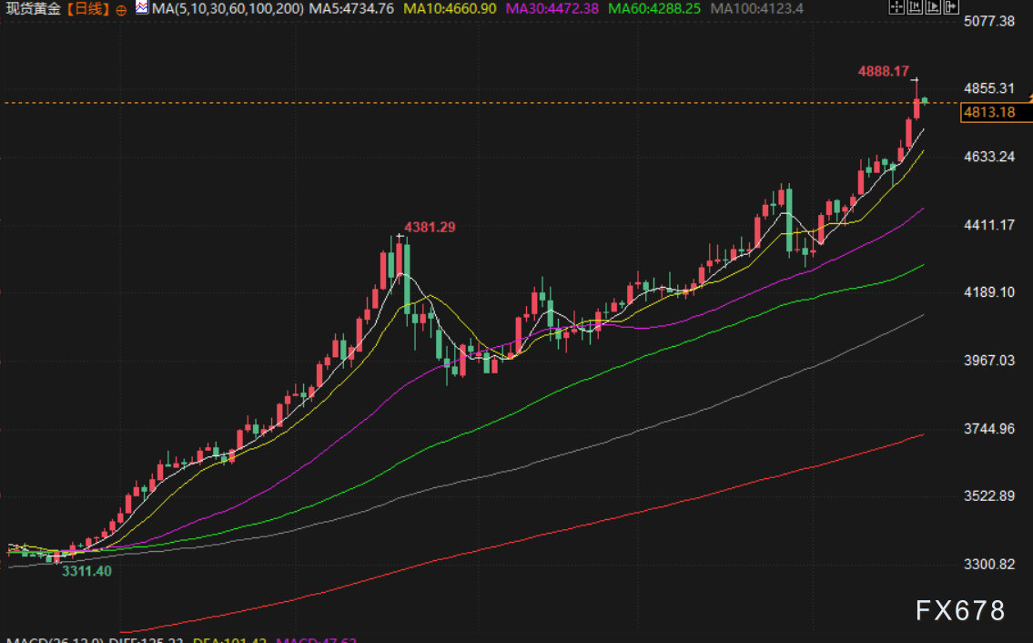 现货黄金周三上涨0.3%,收于每盎司4778.51美元,盘中曾触及4888.17美元的历史新高。美国期金结算价上涨1.5%。分析指出,有关欧美关税威胁撤销的消息提振了股市,导致黄金部分涨幅被抹去,但这可能仅是短期波动,并未改变其长期走势。黄金在2025年大涨64%后,2026年迄今已上涨11%。