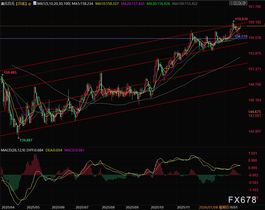 汇通财经APP讯——周四(1月22日)亚欧时段早盘,日元兑美元延续日内稳步下挫态势,触及逾一周低位,美元兑日元汇率持续向159.00关口逼近。