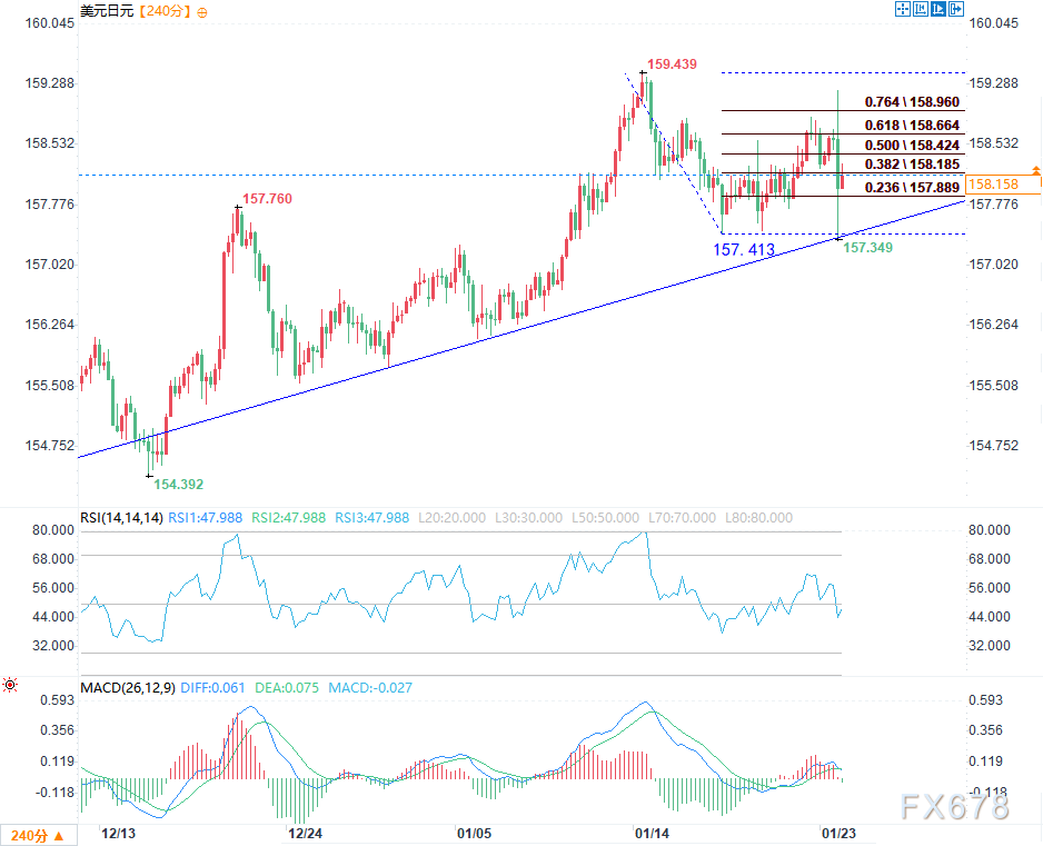 汇通财经APP讯——周五(1月23日)欧盘时段,美元/日元(USD/JPY)呈现“冲高回落+V型反弹”的剧烈波动。价格早盘震荡上行,午后加速拉升至接近159.30的日内高点。价格在探底后逐步反弹,目前回升至158.20一线,处于日内均价(158.45)下方,短期走势偏弱。