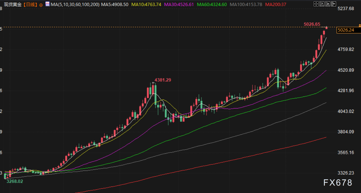贵金属市场正在上演历史性行情,现货黄金周一开盘持续走高,刷新历史新高至5027.45美元/盎司,市场分析认为,地缘政治动荡以及对美国降息的预期,共同推动投资者涌入避险资产。