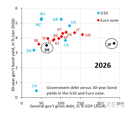 其次,也是更为关键的中期基本面因素,日本的长期利率水平远低于市场自由定价应达到的位置。这意味着,日本高企的公共债务所对应的风险溢价,在债券市场上被人为压制。只要这种状况持续,日元的贬值压力就将一直存在。这也解释了为何2024年的干预未能实现日元的持续走强。
