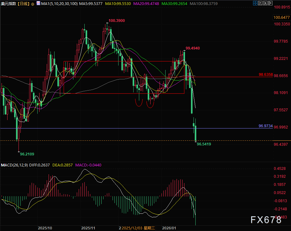 汇通财经APP讯——周二(1月27日),美元指数(DXY)交投于96.6一线附近,距离去年9月低点咫尺之遥。回顾近七个交易日,市场见证了美元近乎单边的急剧下挫,自1月中旬高点累计跌幅已达约3%,月内跌...