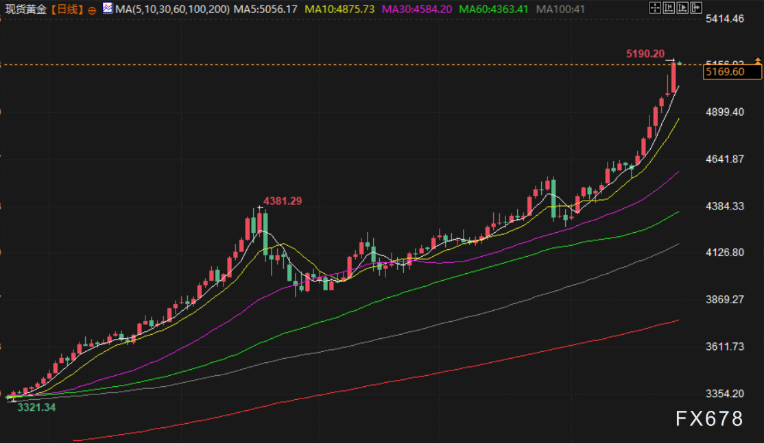 受持续的地缘政治与经济不确定性推动,避险资产需求强劲,金价周二再创历史新高至5190.20美元/盎司,白银亦延续惊人涨势。