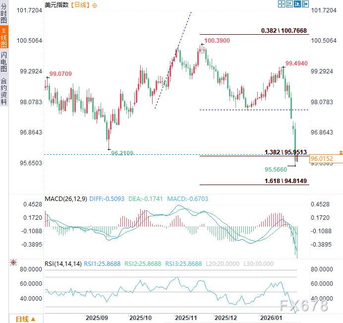 周三(1月28日)亚市时段,美元指数小幅反弹,因此前四个交易日显著下行,一度触及95.57的四年低点,现交投于96.00附近,不过短期技术回调不改整体看跌倾向。