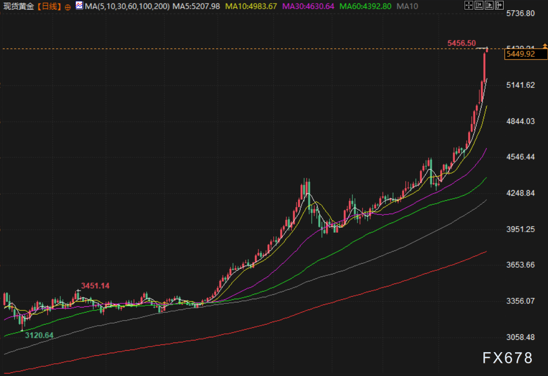 现货黄金价格周三暴涨4%,历史上首次突破每盎司5400美元大关,今年迄今涨幅已超过25%。白银也上涨3.3%,报每盎司116.69美元。