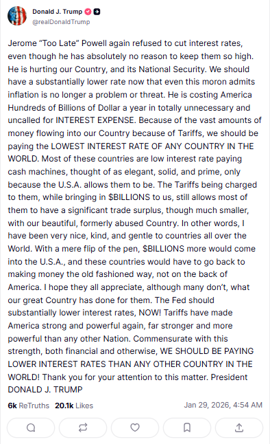FX168财经报社(北美)讯 周四(1月29日),美国总统特朗普在美联储维持利率不变的次日,再度公开批评美联储主席鲍威尔(Jerome Powell)。