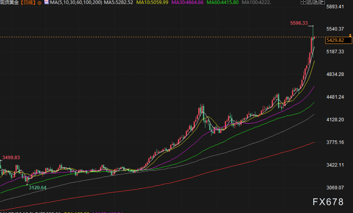 金价周四下跌,因投资者在价格创下历史新高后选择获利了结,但受经济和地缘政治不确定性支撑,金价仍有望录得自上世纪80年代以来的最佳月度表现。现货金下跌1.3%,报每盎司5330.20美元,盘中一度触及5596.33美元的纪录高点后逆转,最低下探至5104.98美元。