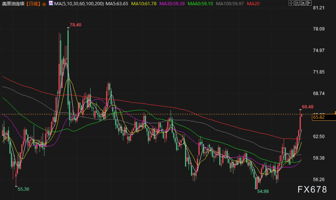 受市场担忧美国可能对伊朗采取军事行动影响,油价周四大幅上涨超3%,攀升至五个月来最高水平。布伦特原油期货上涨3.4%,收于每桶70.71美元;美原油期货上涨3.5%,收于每桶65.42美元,两大基准油价均进入技术性超买区间。