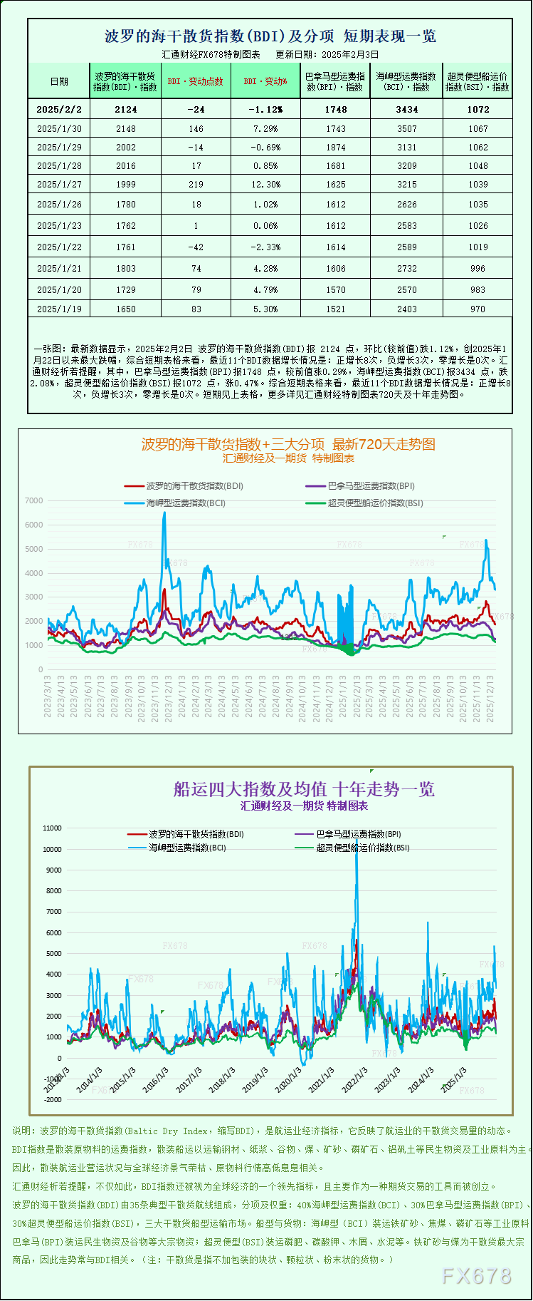 汇通财经APP讯——最新数据显示,2025年2月2日 波罗的海干散货指数(BDI)报 2124 点,环比(较前值)跌1.12%,创2025年1月22日以来最大跌幅,综合短期表格来看,最近11个BDI数...