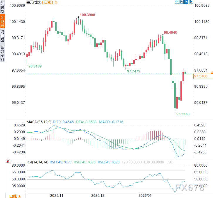 汇通财经APP讯——周一(2月2日)美盘时段,美元指数汇率小幅走高,有望实现连续第四个交易日收涨。截至北京时间00:51,美元指数报97.5785/849,上涨0.449,涨幅0.46%。 src=h...