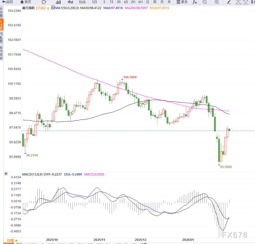 汇通财经APP讯——周一(2月2日)美盘时段,美元指数汇率小幅走高,有望实现连续第四个交易日收涨。截至北京时间00:51,美元指数报97.5785/849,上涨0.449,涨幅0.46%。 src=h...