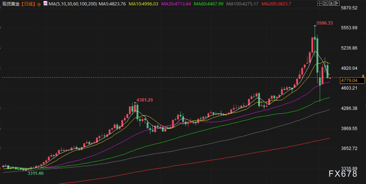 现货黄金下跌1.8%,报每盎司4872.83美元;现货白银则重挫12.1%,至每盎司77.36美元,盘中一度跌至72.21美元低位。美元指数升至两周高点,同时美国股市大幅下挫,促使投资者为弥补其他市场亏损或满足保证金要求而抛售贵金属仓位。