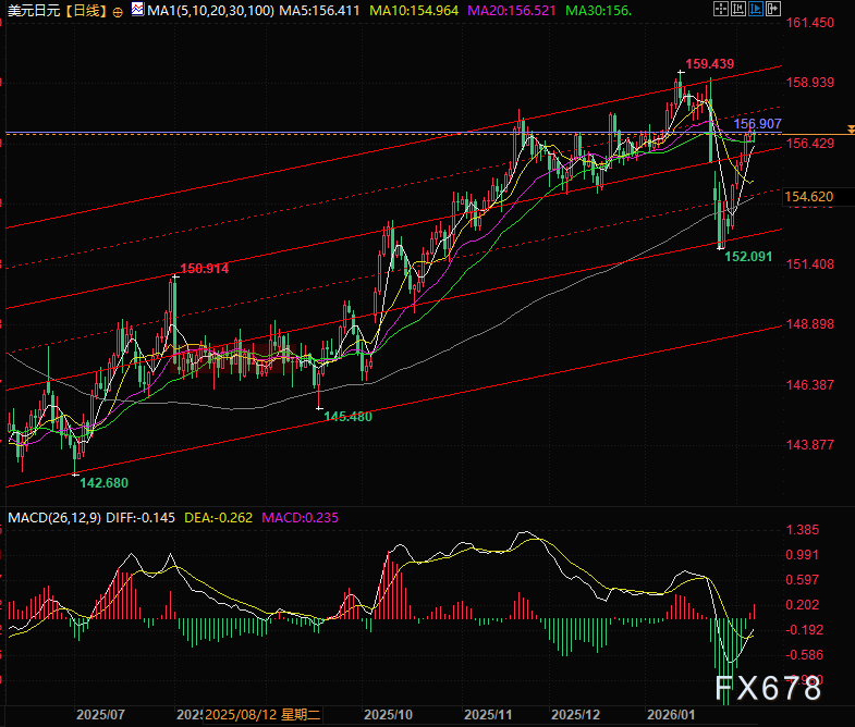 汇通财经APP讯——周五(2月6日)亚欧时段美元兑日元开盘后开始小幅跳水,涨势开始减弱,目前交投于156.76跌0.16%。美元兑日元近期延续偏强态势,但上行节奏始终受限,整体仍处于震荡格局。日本央行...