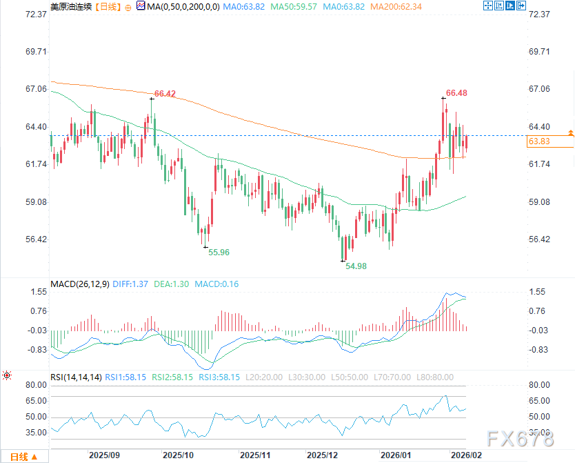 汇通财经APP讯——周一(2月9日)欧盘时段,美国西德克萨斯轻质原油(WTI)期货日内先震荡整理,尾盘出现一波明显拉升,价格突破近期震荡区间上沿,短期多头动能增强,盘中报63.8美元/桶,涨幅0.39%。