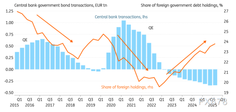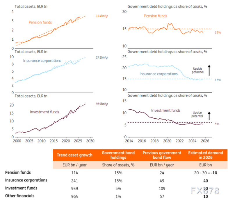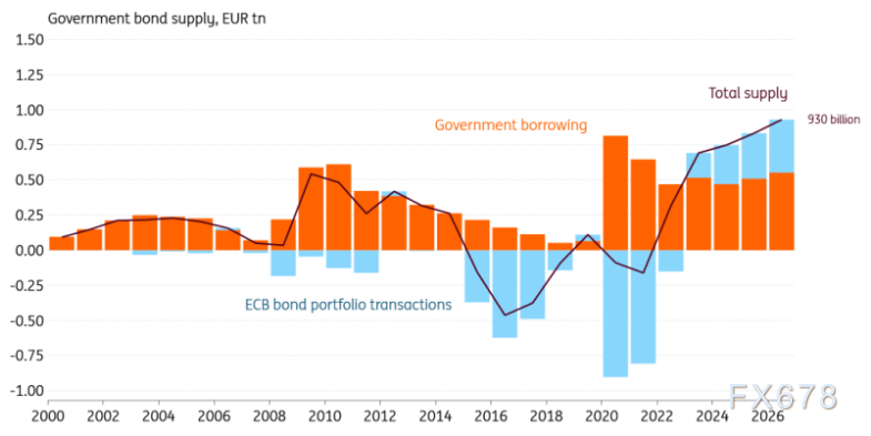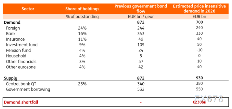 汇通财经APP讯——2026年欧洲政府债券净供应将达创纪录的9300亿欧元。约7000亿欧元需求来自对价格不敏感的买家,但剩余2300亿欧元需由对价格敏感的投资者承接,这可能推动欧元区国债收益率进一步上行,而“去美元化”趋势与欧洲财政风险将共同影响长期资金流向。
