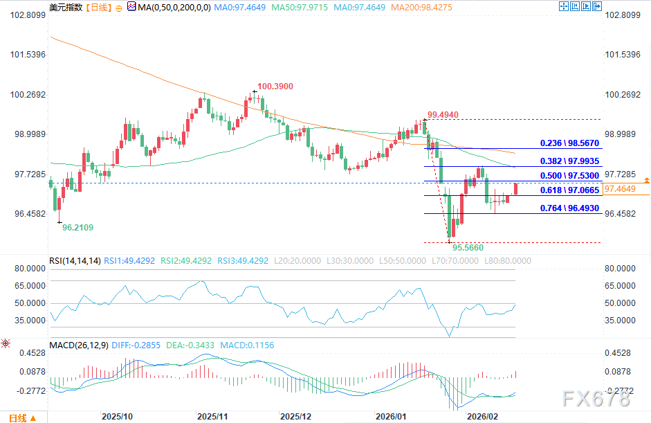 汇通财经APP讯——周三(2月18日)美元指数走高,基本收复前一日的剧烈震荡行情,正向关键轴心位、潜在突破位97.522靠近。