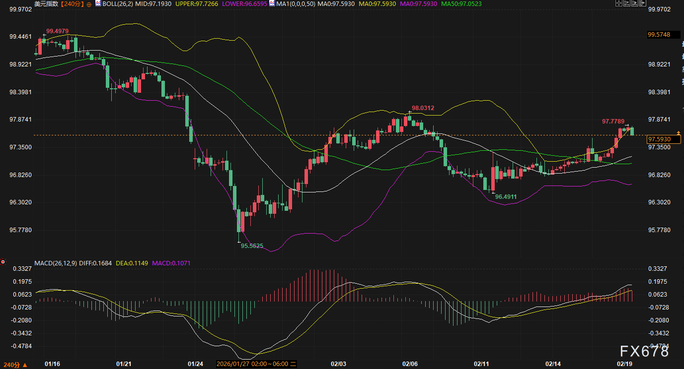 汇通财经APP讯——周四(2月19日)美元指数在97.50附近窄幅整理,隔夜美联储会议纪要显露内部政策分歧,市场在等待欧美PMI数据的同时,也在评估中东地缘局势对避险资金的牵引。技术面上,美元在经历1月底的深V反转后,正于一个清晰的上升通道内运行,但上方面临关键阻力区的压制,短期波幅收敛预示方向选择在即。