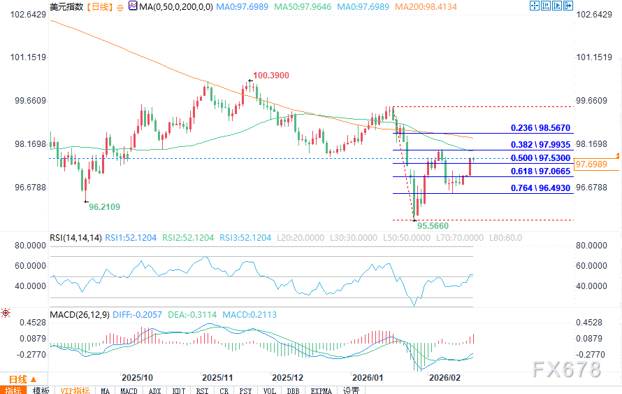汇通财经APP讯——美元指数近期的走势先是一路下探,随后又在低位企稳。回顾日线形态,价格此前曾冲高至99.4940的高点,随即遭遇阻力回落,一路下探至95.5660附近才完成阶段性筑底并展开反弹。2月...