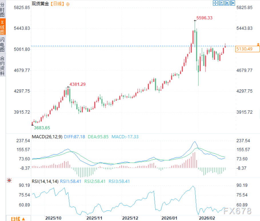 周一(2月23日)欧市时段,现货黄金震荡上行,延续前三个交易日涨势,现交投于每盎司5135美元附近,日内涨幅约0.65%。