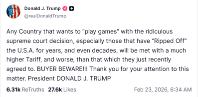 FX168财经报社(北美)讯 美国总统特朗普周一(2月23日)警告各国,不要在近期与美国谈妥的贸易协议上“后退”或“反悔”。在最高法院裁定其紧急关税措施违法后,特朗普表示,若有国家试图借机改变立场,他...