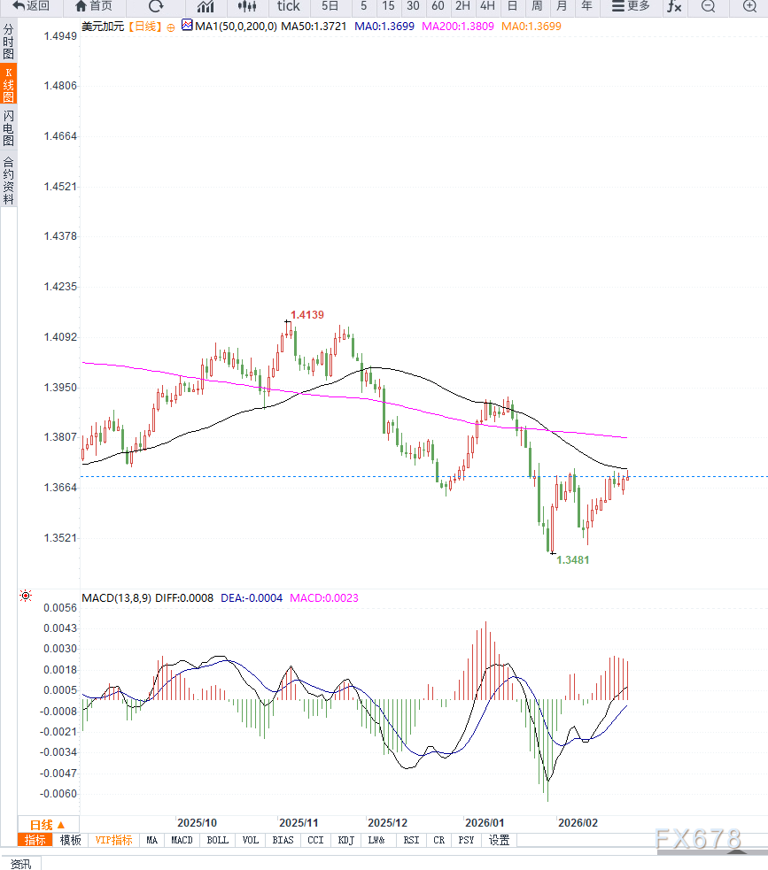 汇通财经APP讯——周二亚盘时段USD/CAD走势呈现震荡上行结构,汇价在1.3715附近获得短线买盘支撑。美元表现相对强势,但上行动能受到贸易政策不确定性与商品市场波动的双重制约。