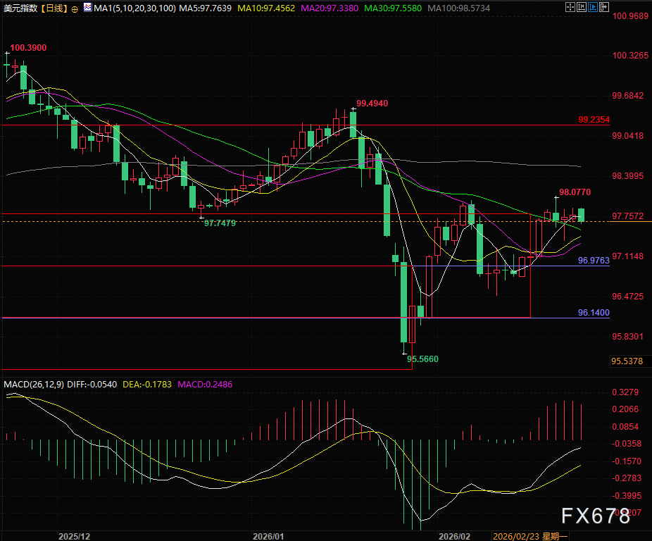 汇通财经APP讯——亚洲交易时段,美元指数(DXY)维持在97.80附近整理,整体呈现弱势盘整结构。市场情绪主要受政策信号与通胀预期双重影响。特朗普在国情咨文中强调经济复苏成果,并重点提及降低通胀水平...