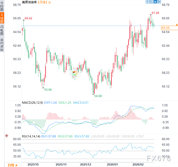 美军大规模部署使霍尔木兹海峡中断预期升温,油价已计入风险溢价。周四(2月26日)欧市时段震荡上涨,现交投于每桶65.60美元附近,日内涨幅约0.25%。