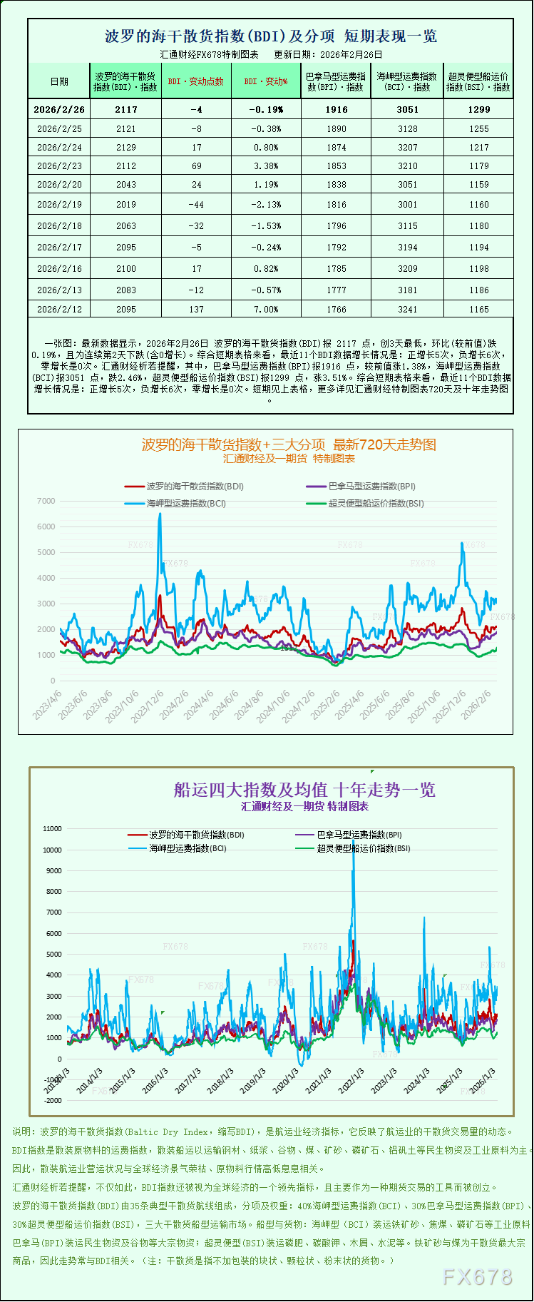 汇通财经APP讯——最新数据显示,2026年2月26日 波罗的海干散货指数(BDI)报 2117 点,创3天最低,环比(较前值)跌0.19%,且为连续第2天下跌(含0增长)。综合短期表格来看,最近11...