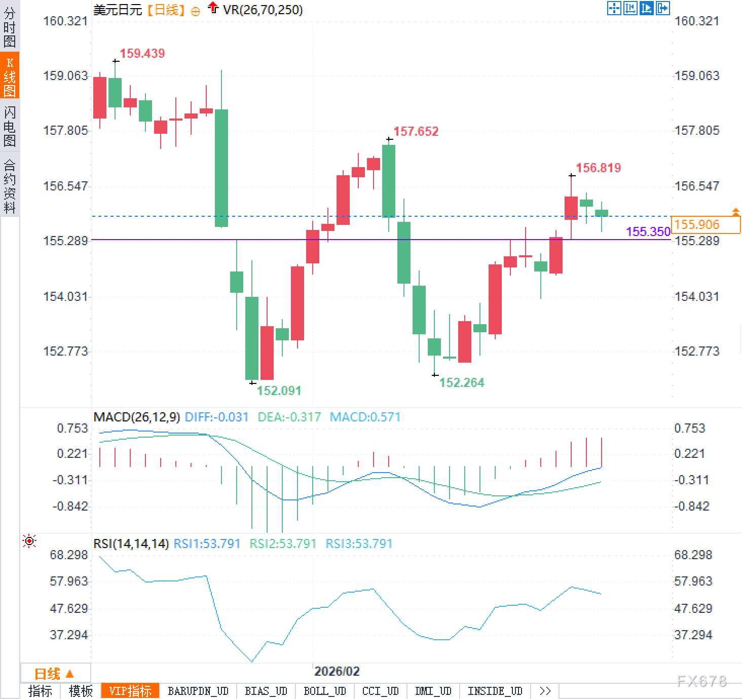 汇通财经APP讯——2月27日周五,美元兑日元美市盘前正卡在155.90的微妙位置,仿佛被一只无形的手按在了156附近的震荡区间里动弹不得。回顾近期的日线走势,汇价从前期高点159.439一路回落,在152.091附近找到了暂时的落脚点,随后展开反弹,却在触及156.819时遭遇了顽强的阻力,不得不回头整理。这种上下两难的格局,恰恰反映了当前市场内心的纠结。