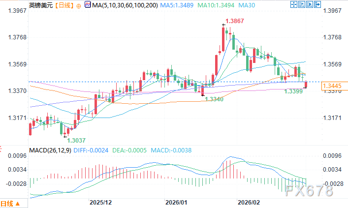 汇通财经APP讯——英镑兑美元周一(3月2日)探底回升,早盘一度跌至1.3399附近,为1月23日以来新低,目前回升至1.3450附近。对日线图的技术分析显示,该货币对倾向持续看跌,因为其交易处于一个下降通道模式内。
