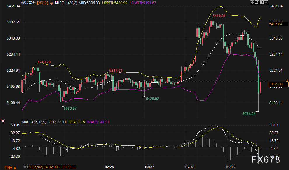 现货黄金在本轮地缘危机中的表现令许多投资者感到意外。通常被视为终极避险资产的黄金,并未能借中东战火之机大幅冲高,反而在周二出现显著下跌,盘中一度下探至5185美元/盎司附近。从60分钟K线图观察,金价自5249美元的高点回落,接连跌破布林带中轨及前期技术支撑位,目前于布林带下轨附近挣扎。MACD指标呈现空头排列,显示短期抛压沉重。