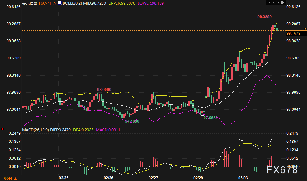 周二(3月3日)欧洲交易时段,地缘政治局势骤然升级,美国及以色列对伊朗目标发动军事打击,引发全球金融市场剧烈波动。然而,与过往地缘危机爆发时市场呈现的典型“避险模式”不同,本次各类资产的反应呈现出显著分化与结构性特征。美元指数延续强势,一举突破99关口,触及一个月以来新高。美债10年期收益率在经历短暂下探后迅速V型反弹,重新回到4.0%上方运行。这种资产价格表现的分化,揭示了当前市场交易逻辑的核心已从单纯的地缘恐慌,转向对通胀预期重估以及能源冲击结构性影响的深度定价。