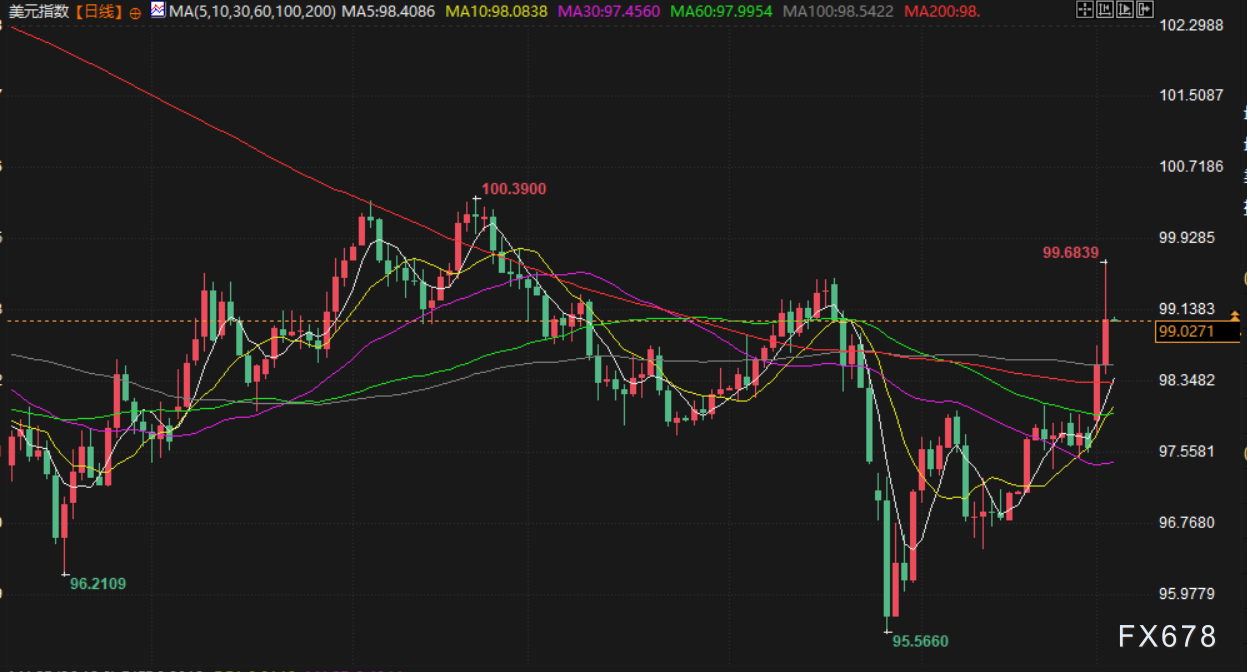 受中东紧张局势引发的通胀风险重燃影响,美元大幅走强,兑欧元、英镑和日元汇率升至数月高点,同时市场下调了对主要央行降息的预期。美元指数上涨0.5%至98.995,此前曾触及三个多月高点。