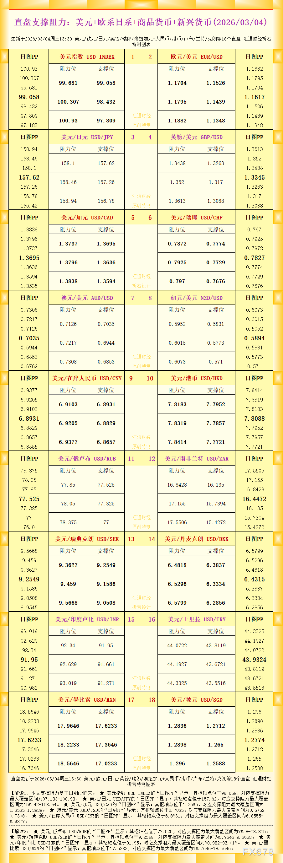 汇通财经APP讯——一张图看直盘支撑阻力:美元+欧系日系+商品货币+新兴货币,更新于2026年3月4日周三13:30,具体美元/欧元/日元/英镑/瑞郎/澳纽加元+人民币/港币/卢布/兰特/克朗等18个...