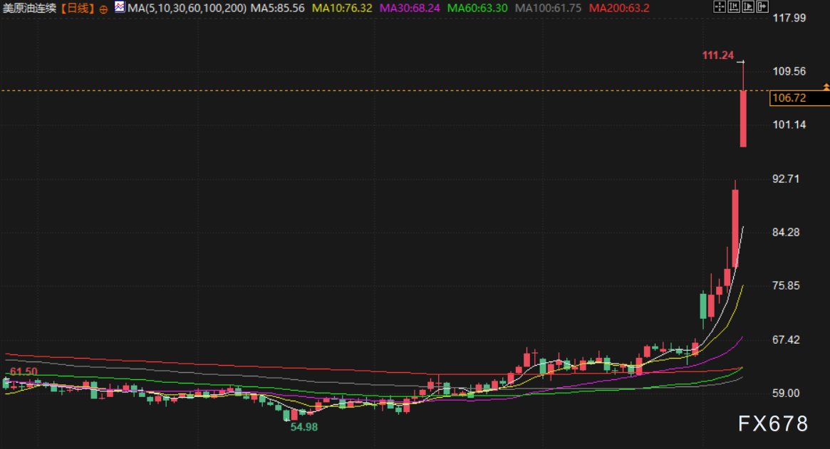 美原油周一高开,涨幅超20%,站上100美元/桶上方,最高至111.24美元/桶,触及2022年7月以来最高水平,受益于伊朗冲突恶化推动,伊拉克和科威特的石油生产已开始停产,周末美伊都表态强硬,同时,以军称将视哈梅内伊继任者为目标。