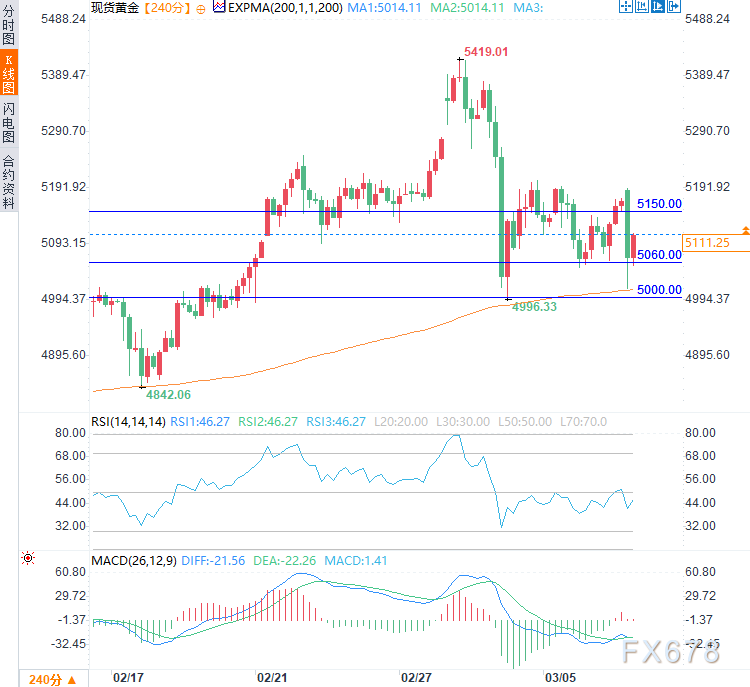 汇通财经APP讯——周一(3月9日)亚市时段,现货黄金震荡下行,现交投于每盎司5120美元附近,虽在5000美元心理位上方获得部分支撑,但日内跌幅约为0.85%。避险买盘未能有效抵挡通胀预期升温与美元强势的双重压力,金价出现明显回调。