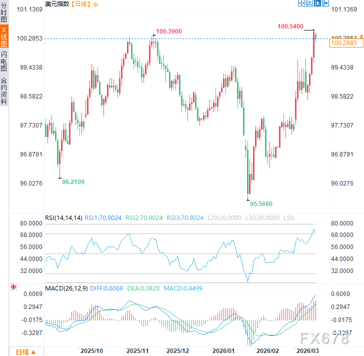汇通财经APP讯——美元指数周五全线上涨,攀升至去年11月以来的最高水平,收报100.50,周线累计上涨1.67%。此轮美元走强的核心驱动力在于其避险资产的属性。随着特朗普总统誓言对伊朗发起“猛烈打击...